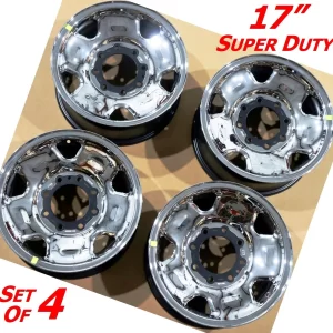 Set of genuine Ford Super Duty 17×7.5 Chrome Steel Wheels with 8×170 bolt pattern. Durable OEM wheels designed for 2005–2009 F250/F350 models.