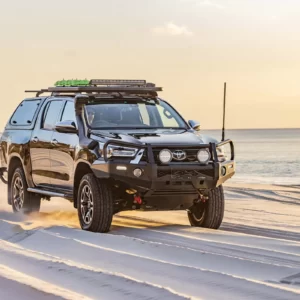 Providing superior frontal protection for your Toyota HiLux (2020-2025), the Deluxe Bull Bar includes a robust 50mm triple-hoop, 12,000 lb chassis mounted winch cradle and integrated led fog lights, blending durability with functionality and classic styling.